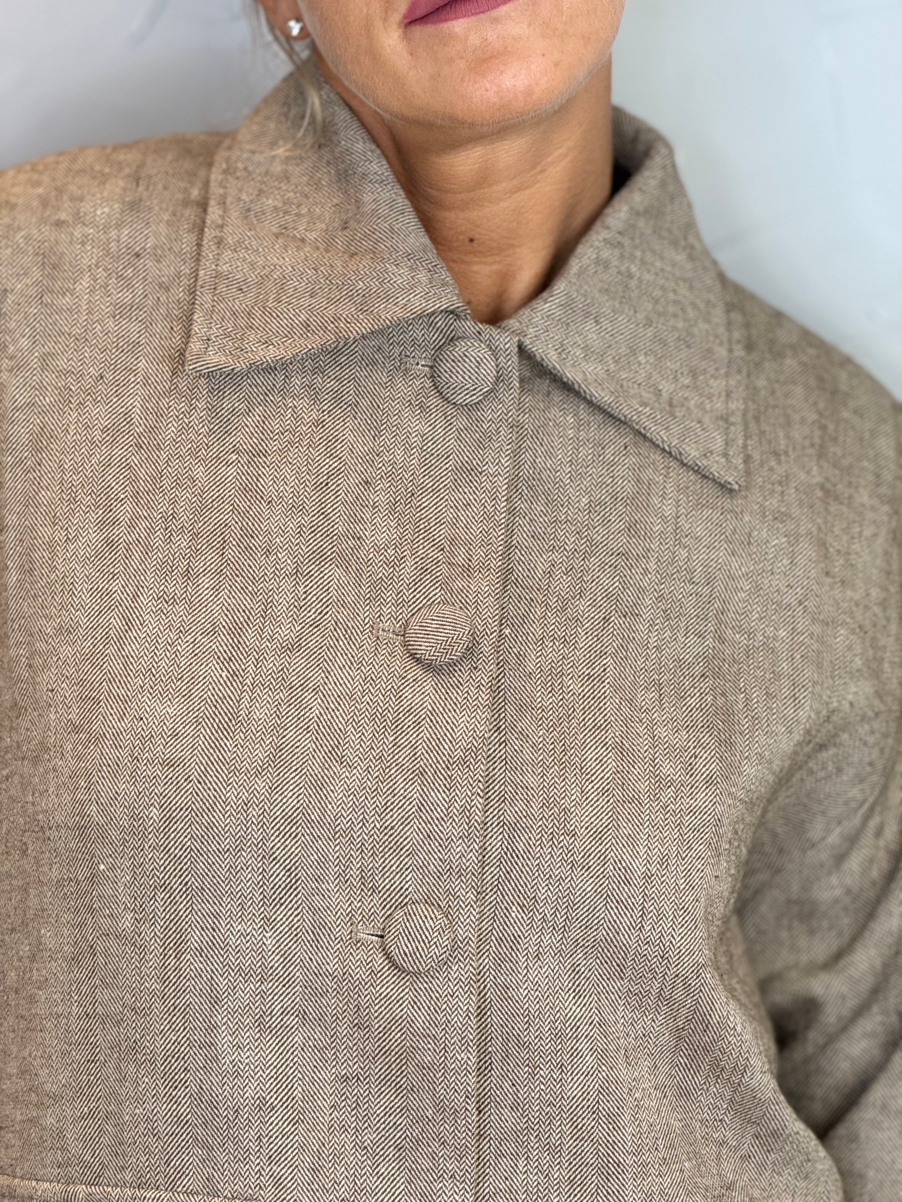 Giacca foderata con fodera a righe , bottoni ricoperti frontali taschini applicate , colletto, e sul retro una ripresa rende la giacca morbida portabile anche come capo spalla per l’attacco stagione